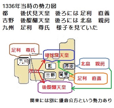 時代背景 元弘3年・正慶2年(1333)鎌倉幕府が滅亡して、 ![]() 元号→元弘(げんこう):南朝がつけた。 正慶(しょうきょう):北朝がつけた。 |